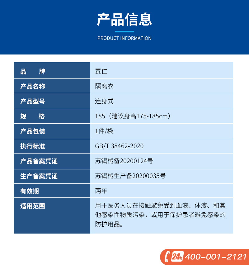 商品名称:赛仁 一次性医用隔离衣 连身式防护衣 防护服 大码