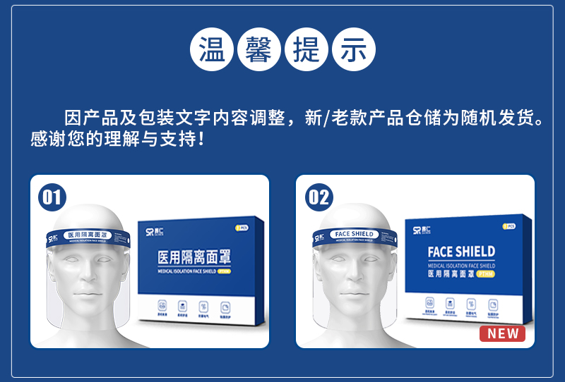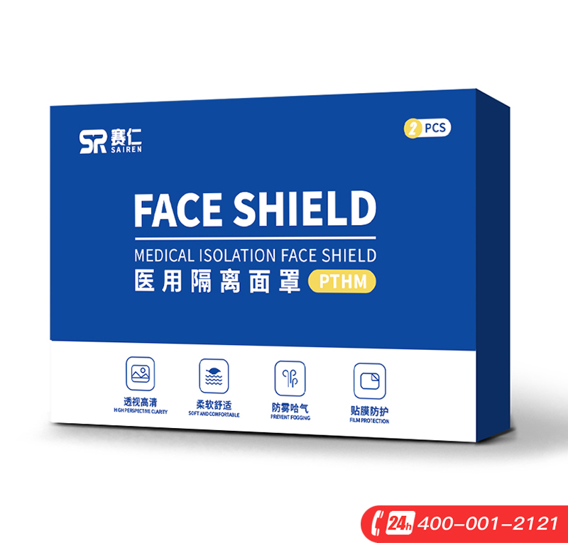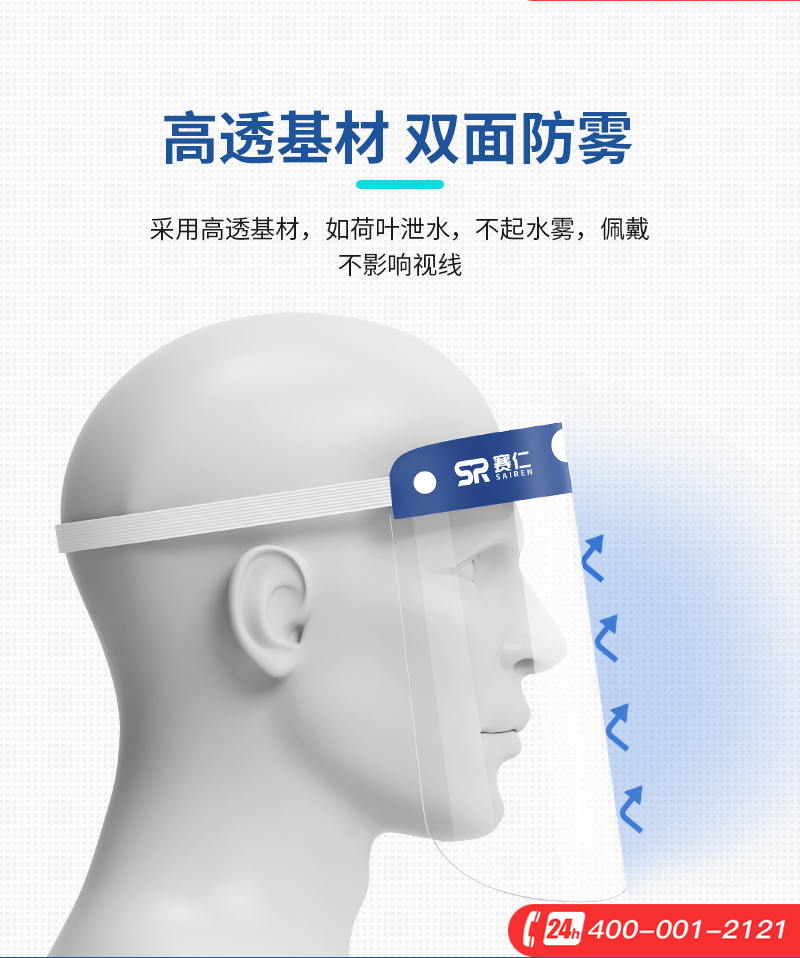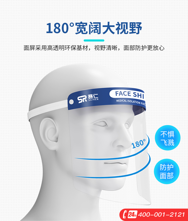 商品名称:赛仁 医用隔离面罩 防护面屏 防灰防尘防飞沫防液体喷溅 全脸防护 高清透光 大屏保护面罩 2片/盒装