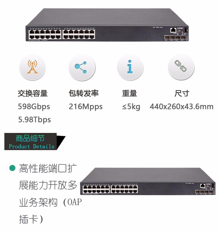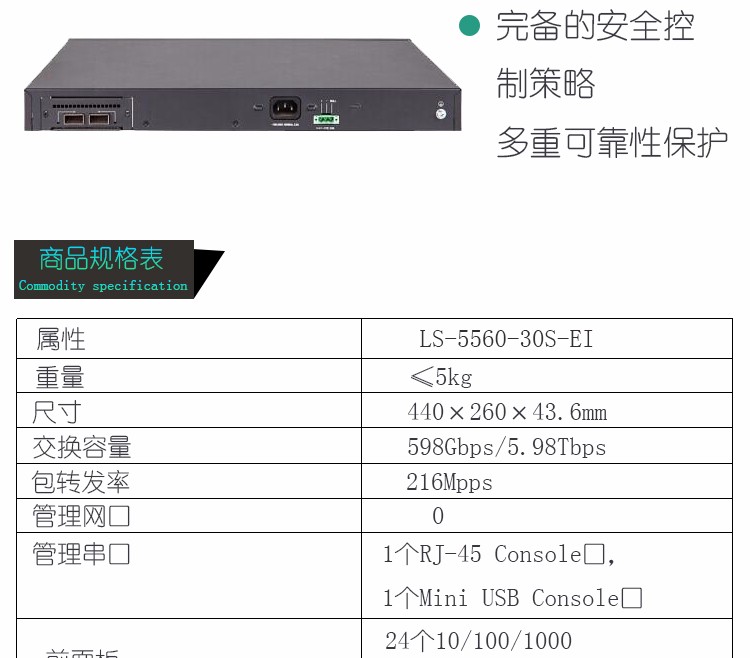商品名称:交换机 H3C LS-5560-30C-EI 强三层千兆交换机 L3以太网交换机主机,支持24个10/100/1000-T端口,支持4个10G/1G -X SFP+端口,支持1个Slot,无电源