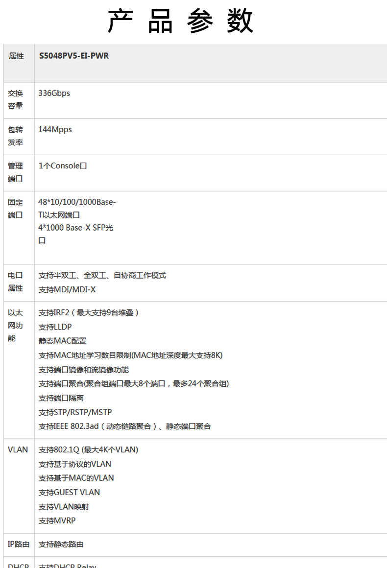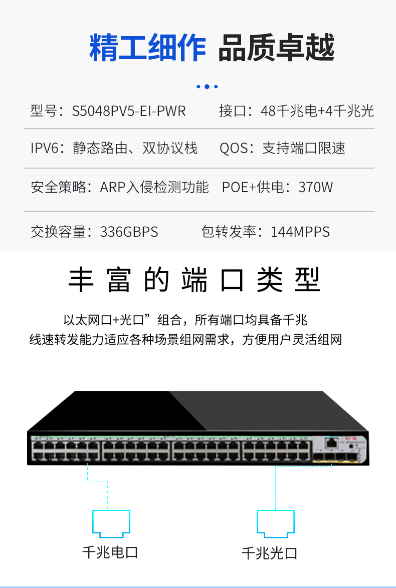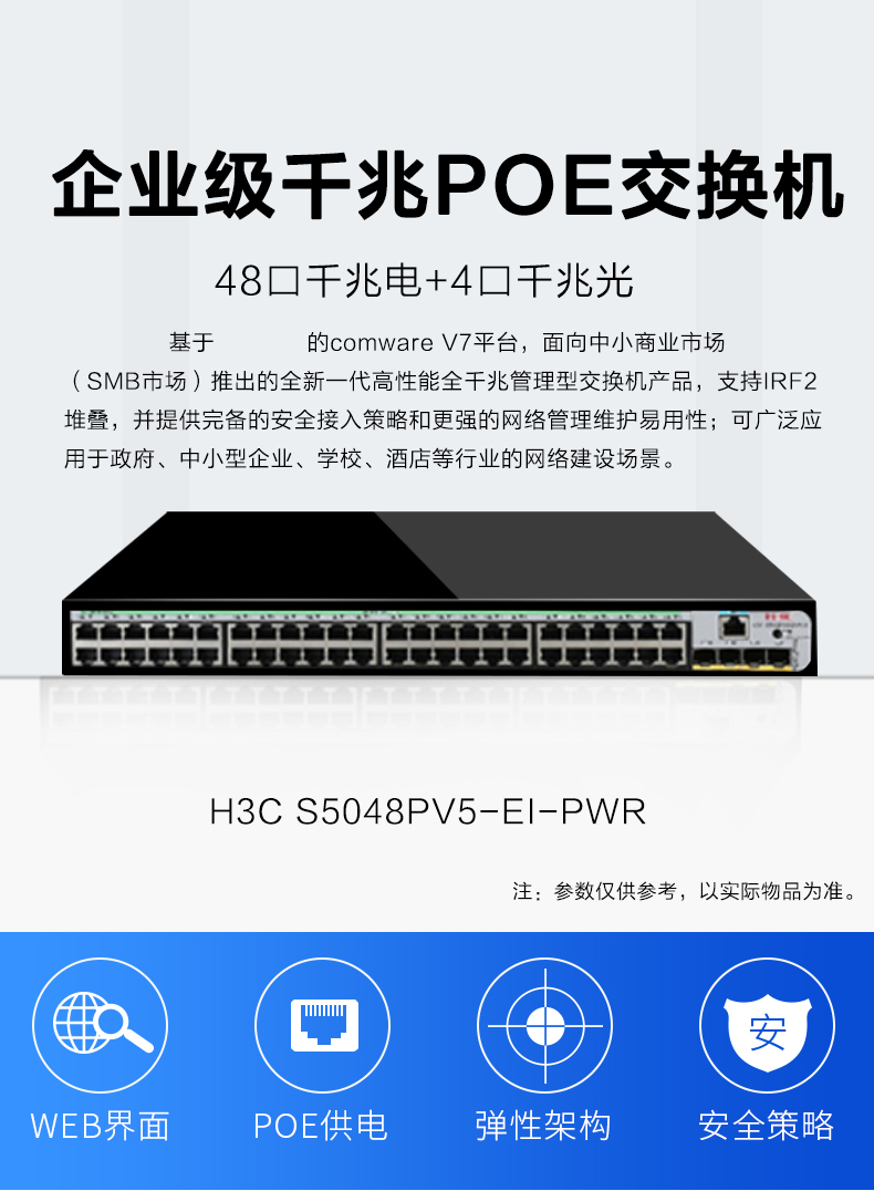 商品名称:H3C 华三 S5048PV5-EI-PWR 48口全千兆网管交换机PoE增强供电