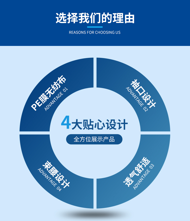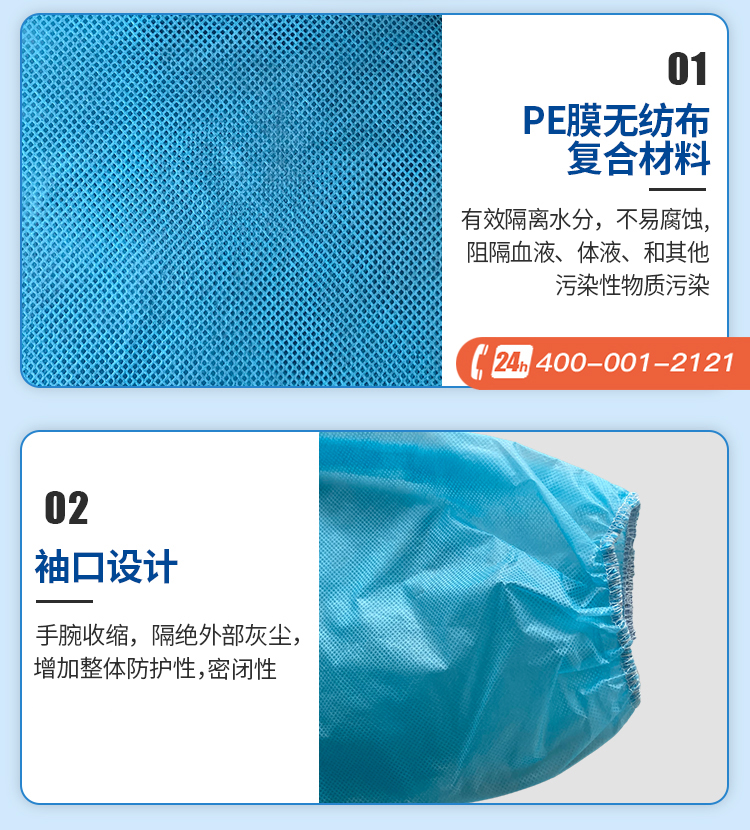 • 结构及组成:采用PE膜无纺布符合面料,经裁剪、缝纫制成。非无菌提供,一次性使用。