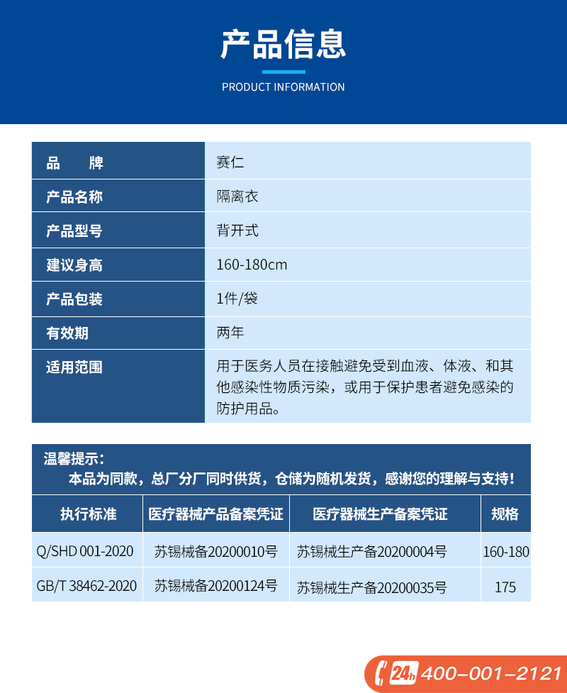 商品名称:赛仁 一次性医用隔离衣 手术衣 背开式防护衣 防护隔离服(蓝色款)