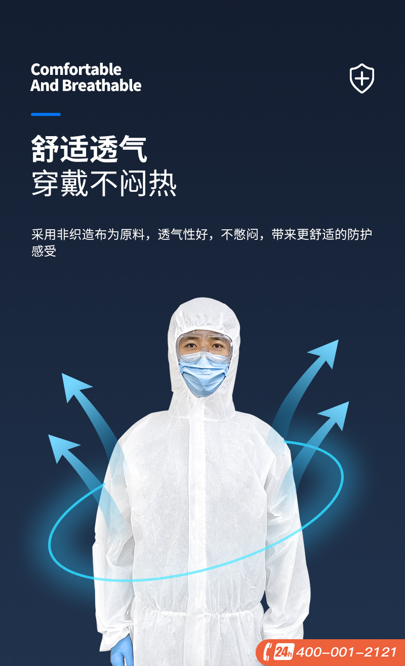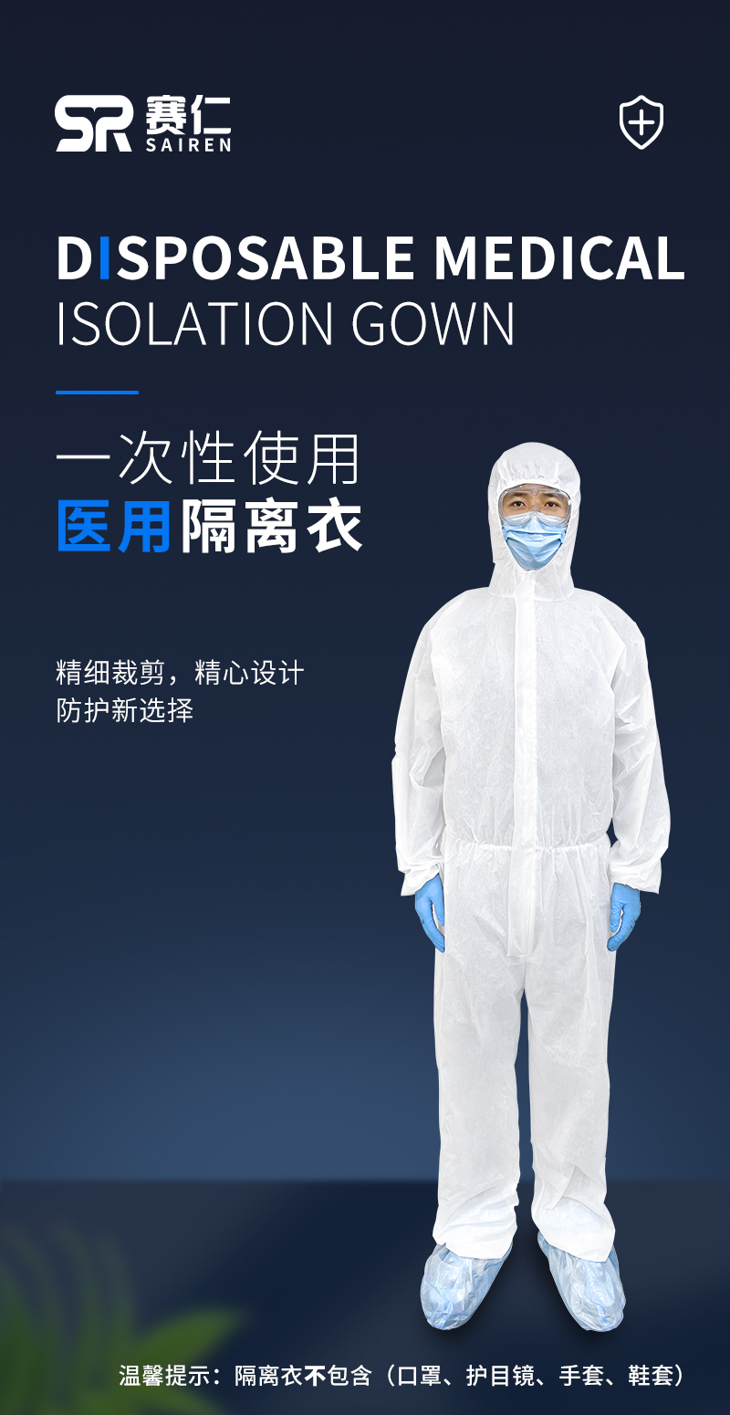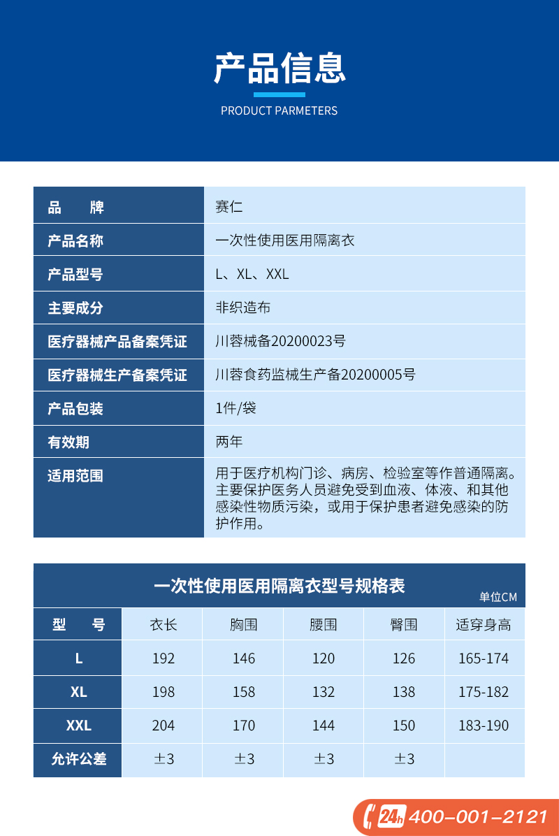 商品名称:赛仁 一次性医用隔离衣 连身式防护衣 隔离服 大码 XXL(183-190cm)
