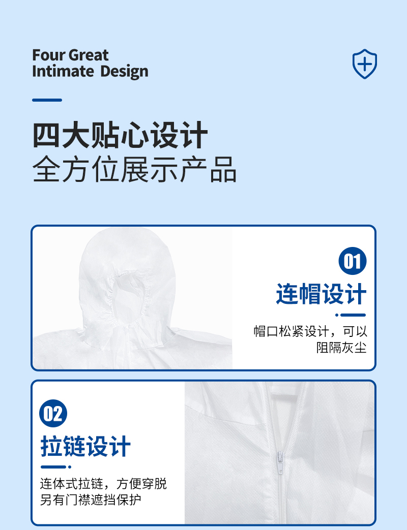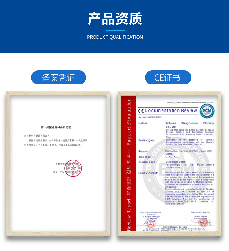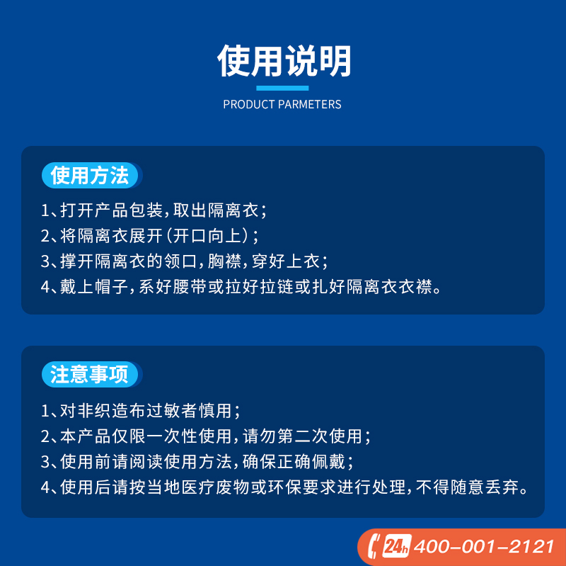 • 结构及组成:采用PE膜无纺布符合面料,经裁剪、缝纫制成。非无菌提供,一次性使用。